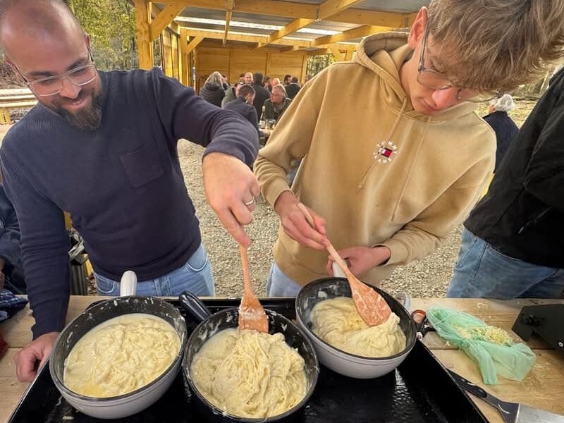 Au programme : Repas savoyard dans une de nos cabanes au milieu des bois, réchauffée par notre poêle à bois. Nous poursuivrons ensuite la journée avec nos activités couvertes au cœur de la forêt de la Boissière : ball-trap, lancer de haches et tir à l’arc. Le tout accompagné de braseros et de vin chaud pour réchauffer l’atmosphère.
